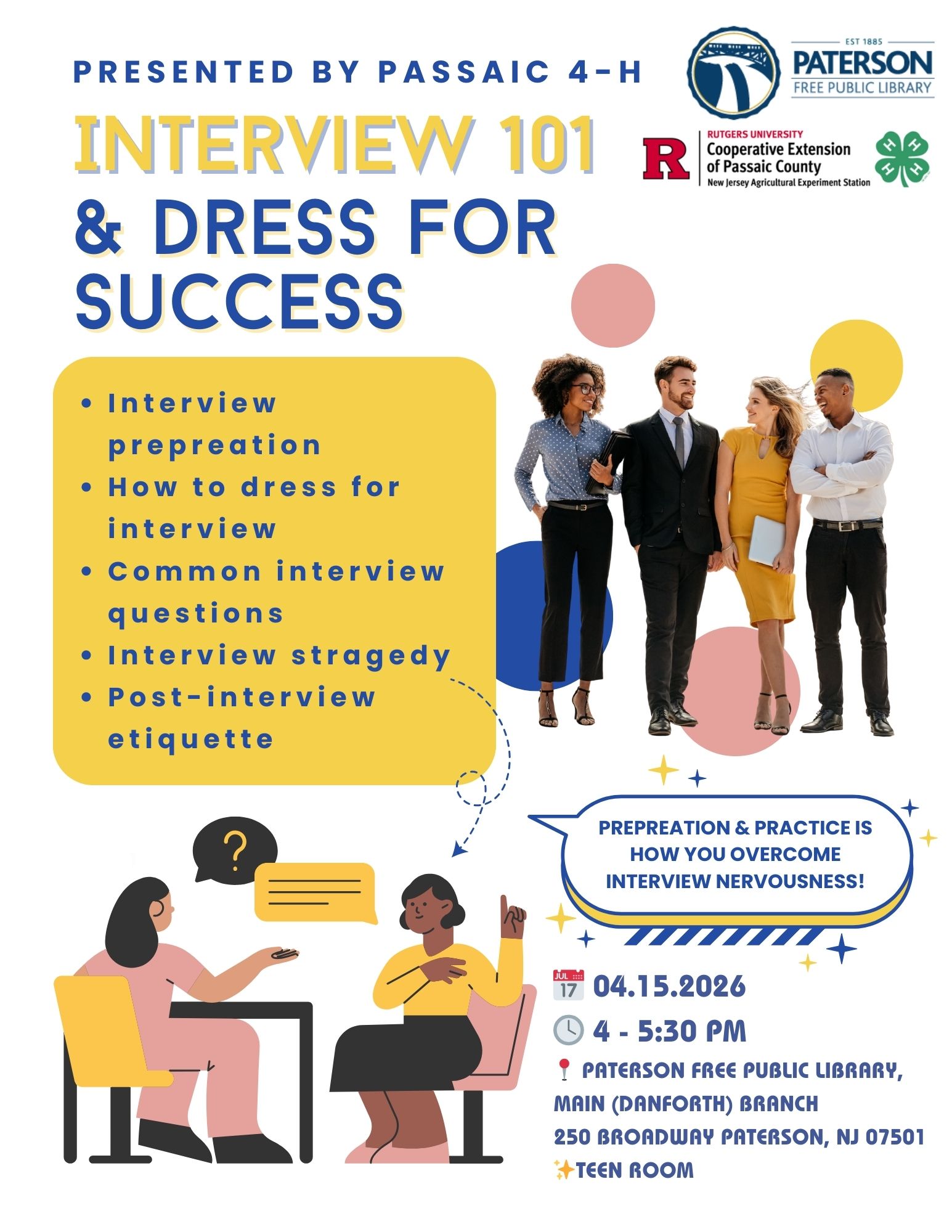 - April 15th – Interview 101 for Teens at Paterson Free & Public Library (no sign-up required)